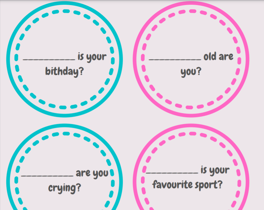 Wh-questions chart to know how to use them and an activity to play with students through speaking, matching, writing in small whiteboards,...